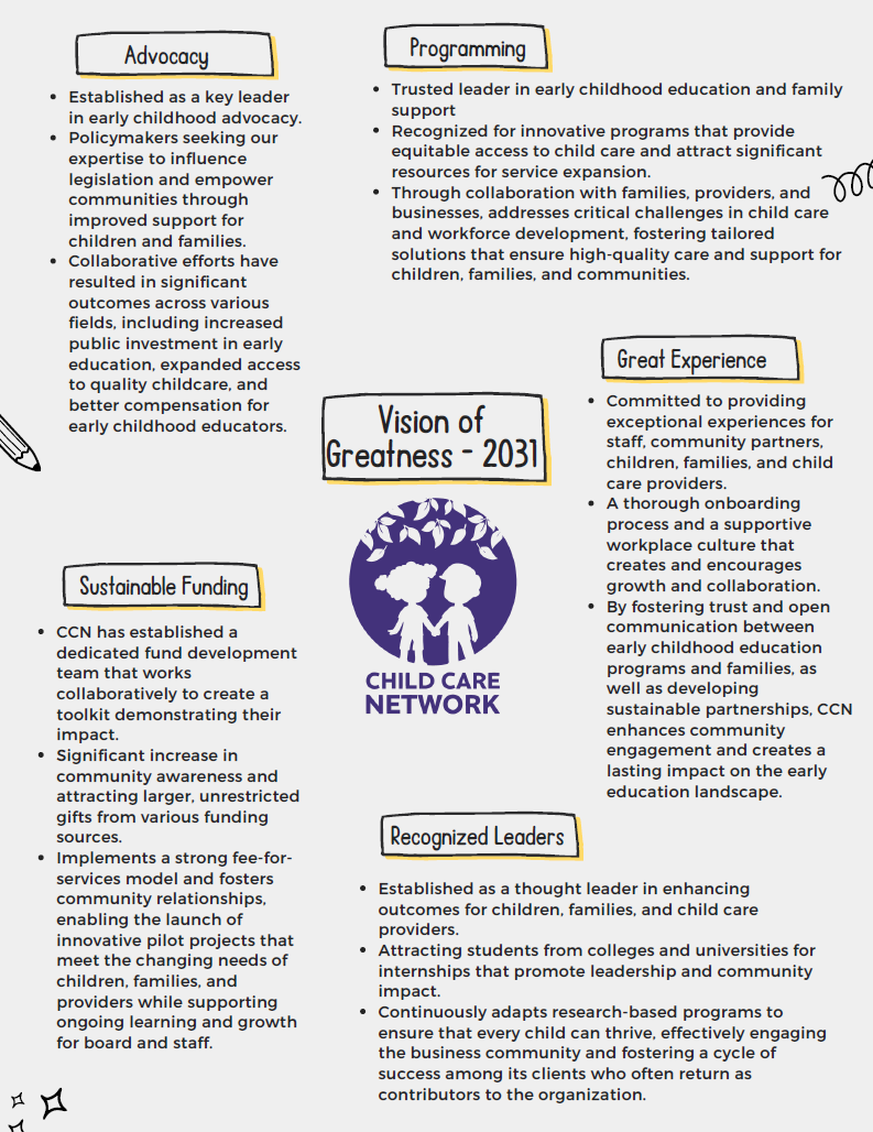 Established in 1971, Child Care Network (CCN) is a non-profit organization whose mission is to promote the success of children, families and our community through quality child care education, advocacy and family support.